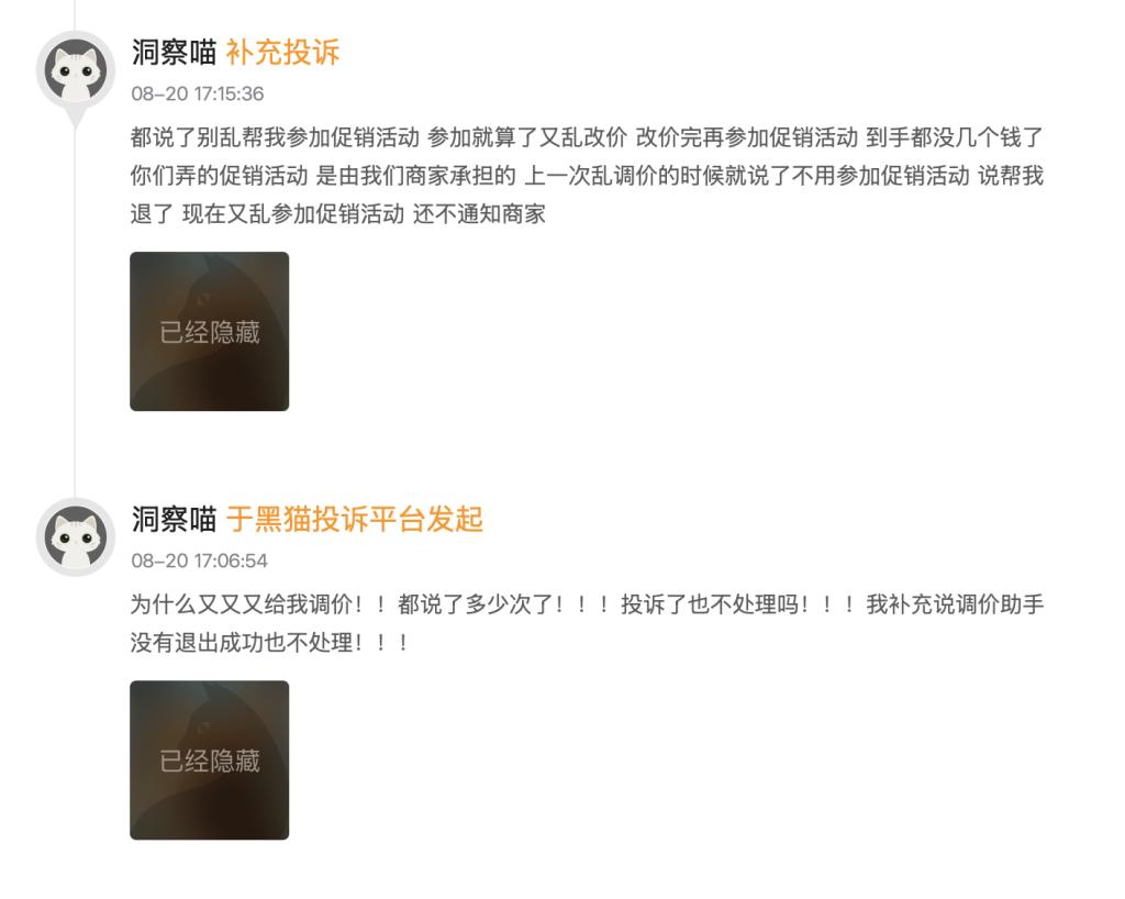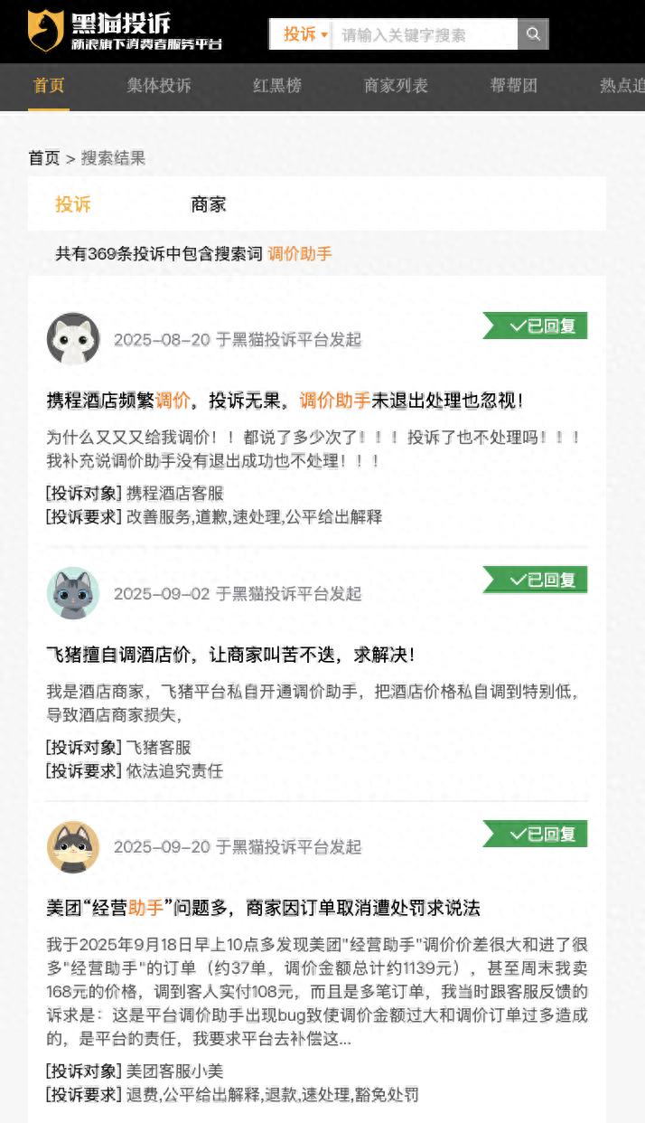 事实上,早在今年5月,就有酒店商家在多个投诉平台和社交平台上反映携程的“调价助手”功能频繁调价,且功能无法关闭,打乱酒店经营节奏等。而澎湃新闻在投诉平台上看到,除了携程,多家OTA(在线旅游平台)的类似功能也有被投诉的记录。