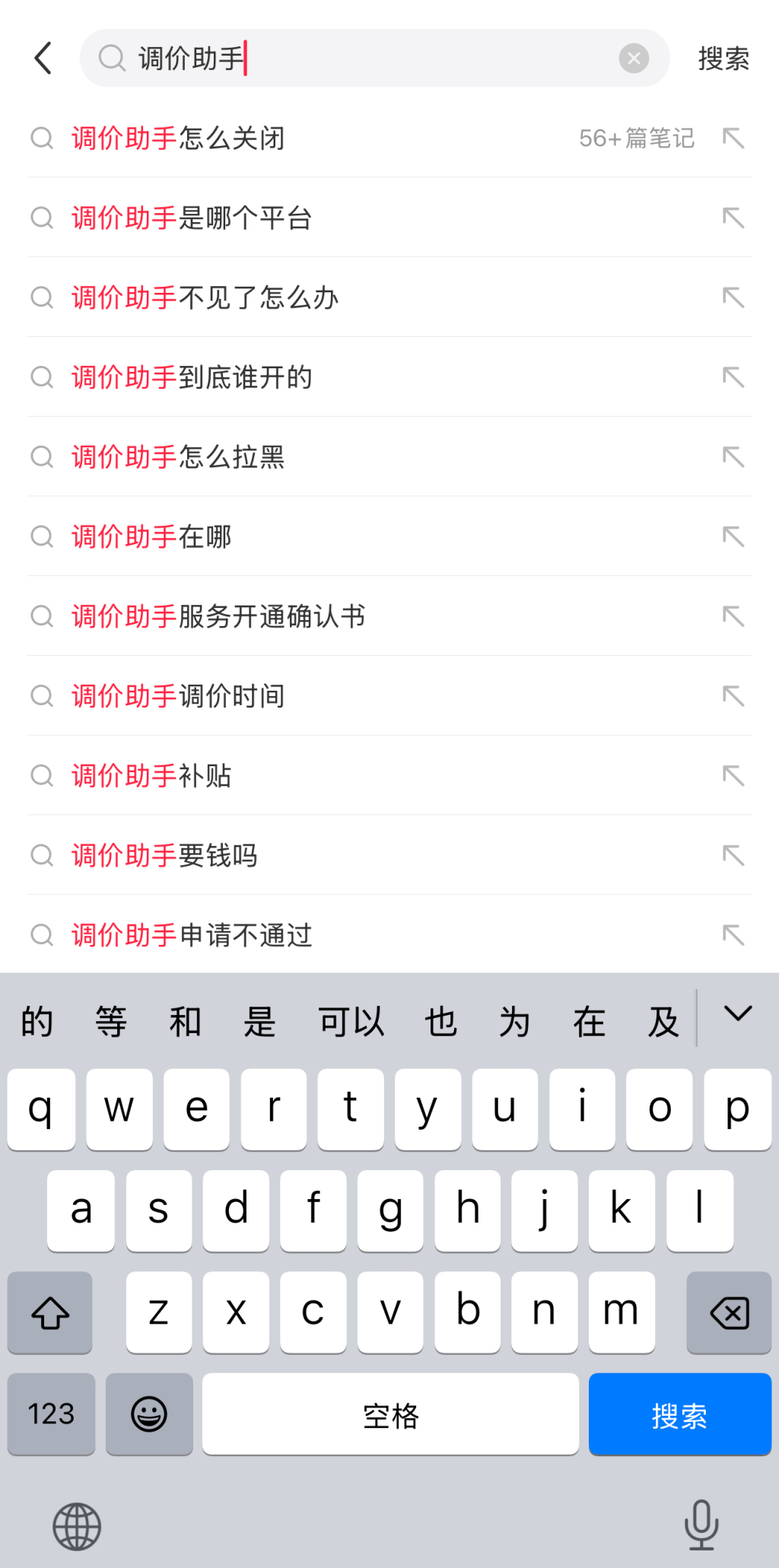 澎湃新闻在社交平台搜索“调价助手”关键词发现,最多的相关搜索内容是“调价助手怎么关闭”。