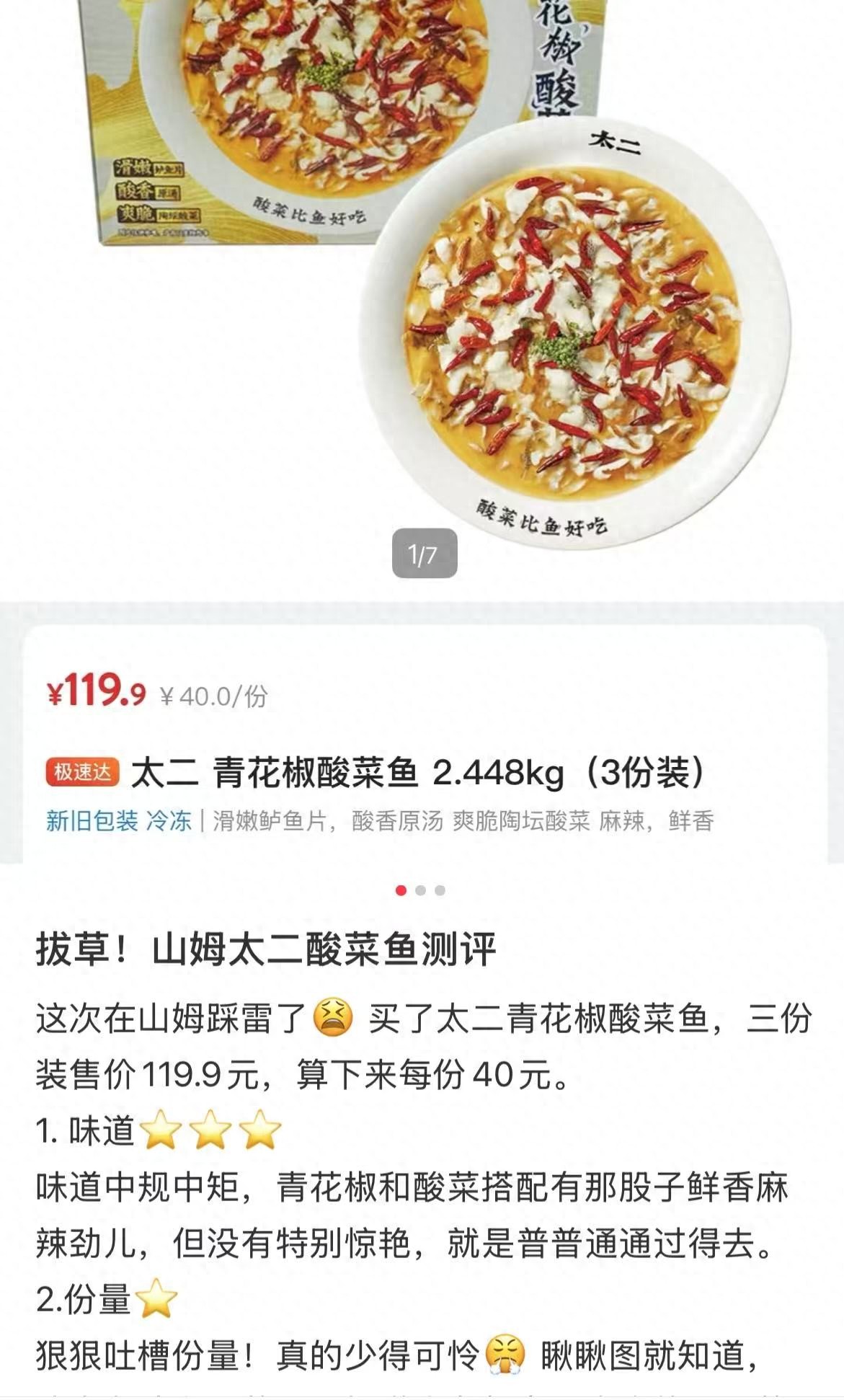 界面新闻记者搜索社交平台发现,有不少消费者已经购买过山姆上架的太二酸菜鱼预制菜,评价口味还原度八成,操作简单,不过分量很少。