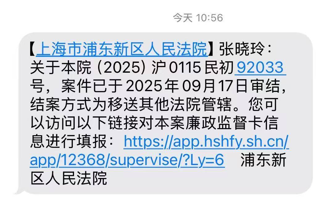 此次案件移交,意味着她的管辖权异议得到了法院支持。张晓玲展示的法院短信截图显示,(2025)沪0115民初92033号案件已于2025年9月17日审结,结案方式为“移送其他法院管辖”。