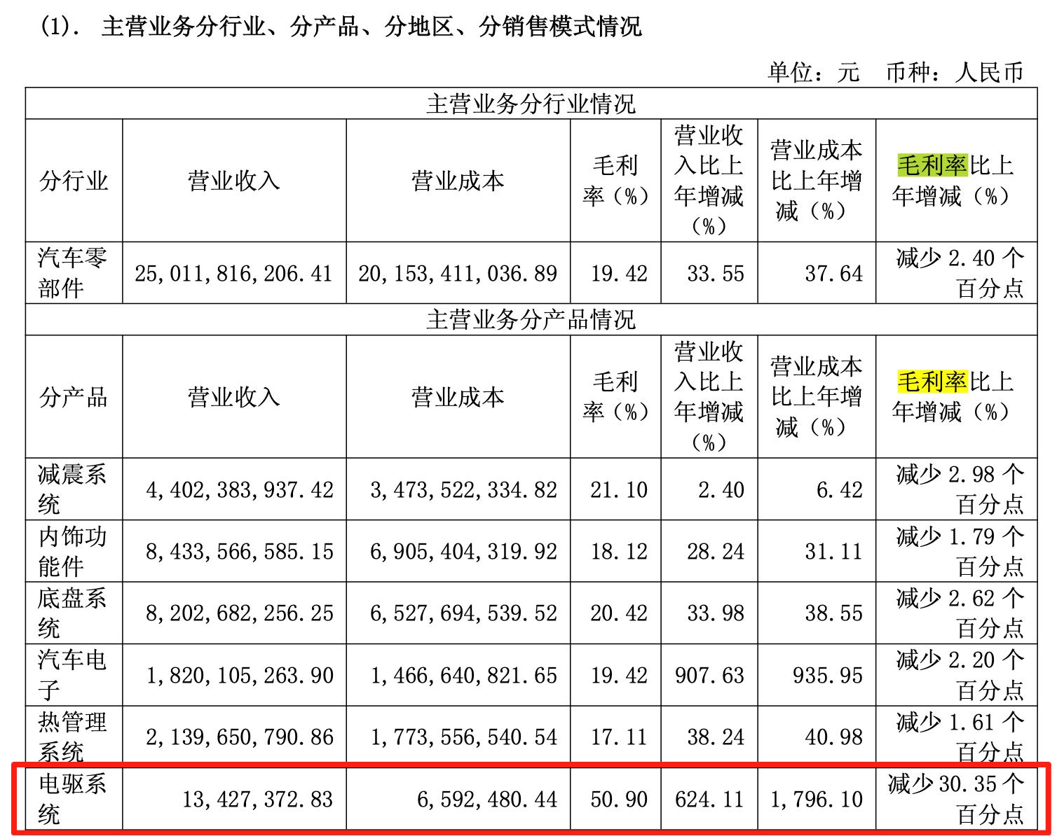 机器人相关电驱系统毛利率大幅下滑。拓普集团2024年财报截图