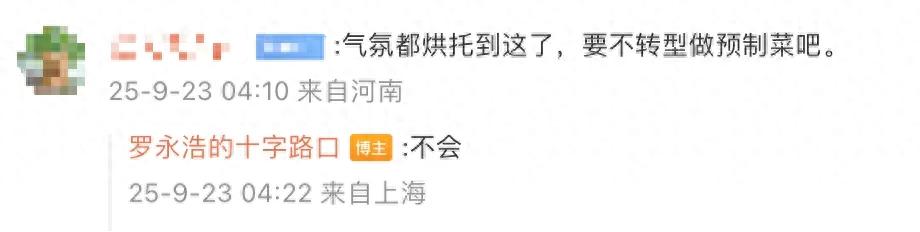 有网友评论道:气氛都烘托到这了,要不转型做预制菜吧。罗永浩回复“不会”。