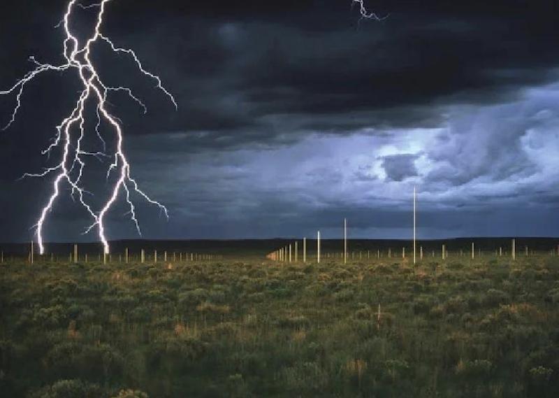 沃尔特·德·玛利亚,《闪电原野》(1977)。在新墨西哥高原上,400根不锈钢杆排列成网格阵列,等待雷暴来临时的自然放电。作品将不可控的自然现象转化为艺术核心,融合了数学精确性与原始能量崇拜,强调观众需亲历其境与耐心等待,挑战了即时消费的艺术体验模式。