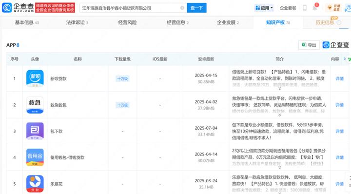 企查查显示,华鑫小贷旗下有8款贷款产品,分别为新呗贷款、救急钱包、包下款、备用钱包-借钱贷款、乐意花、拍拍白条、恒易借、微花钱包,其中后三款APP目前已经下架。