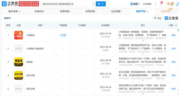 企查查显示,除了小橙借款,南京乐在小贷旗下贷款APP还有小福借款、享借钱、多乐分期、借花分期等。