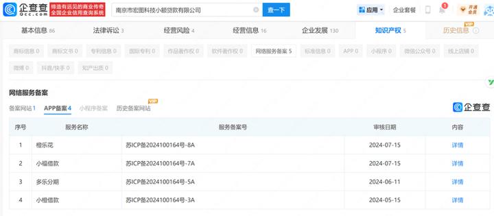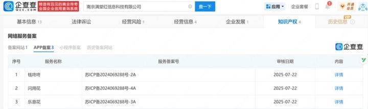 公开信息显示,南京满堂红科技成立于2024年1月,注册资本100万元。企查查显示,除了闪用花,南京满堂红科技APP备案还包括钱咚咚以及乐意花,备案时间均在2025年7月22日。