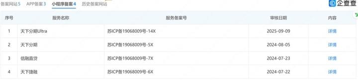 捷融小贷成立于2016年,其注资为3亿元,企查查显示,其备案的APP包括小福借款、天下分期、小红花,备案的小程序包括天下分期、天下分期Ultra、信融直贷、天下捷融。