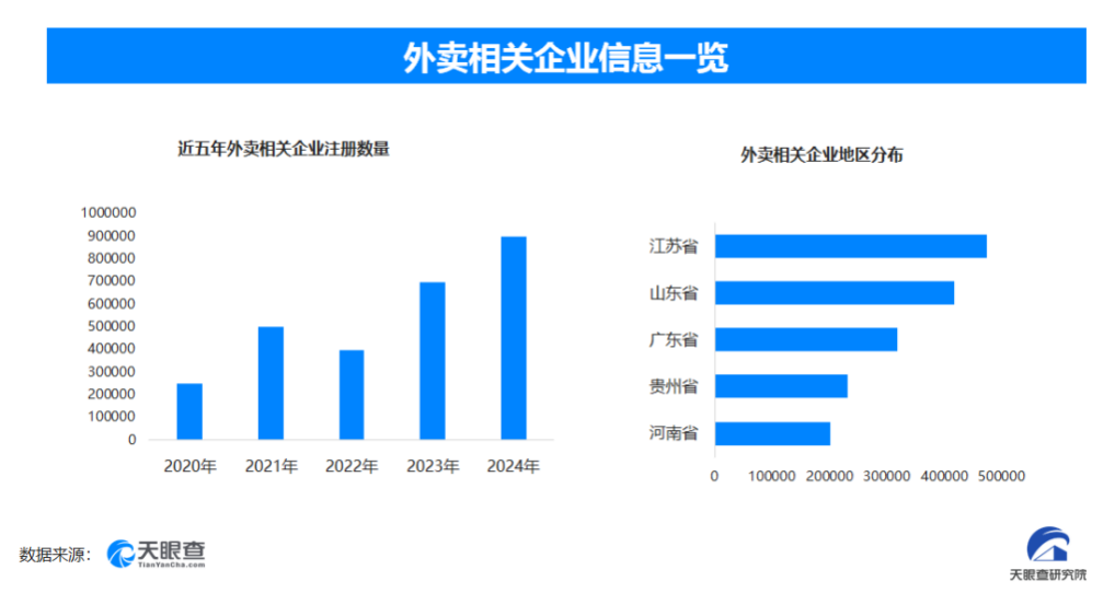 天眼查专业版数据显示,截至目前我国现存在业、存续状态的外卖相关企业超350.4万家。其中,2025年截至目前新增注册相关企业约54.5万余家,从企业注册数量趋势来看,近五年间,除2022年稍有下降外,外卖相关企业的注册数量呈现出逐年增长的态势,并在2024年达到顶峰。