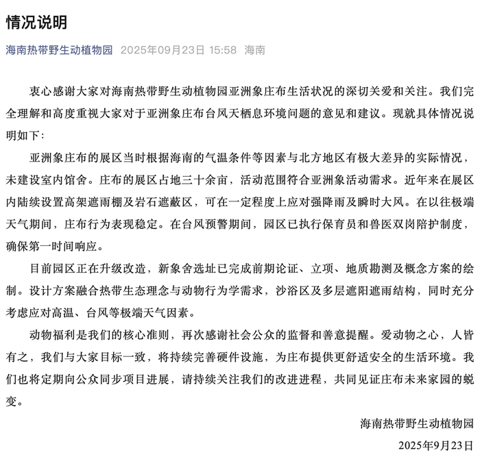 海南热带野生动植物园9月23日发布情况说明称,完全理解和高度重视大家对于亚洲象庄布台风天栖息环境问题的意见和建议。
