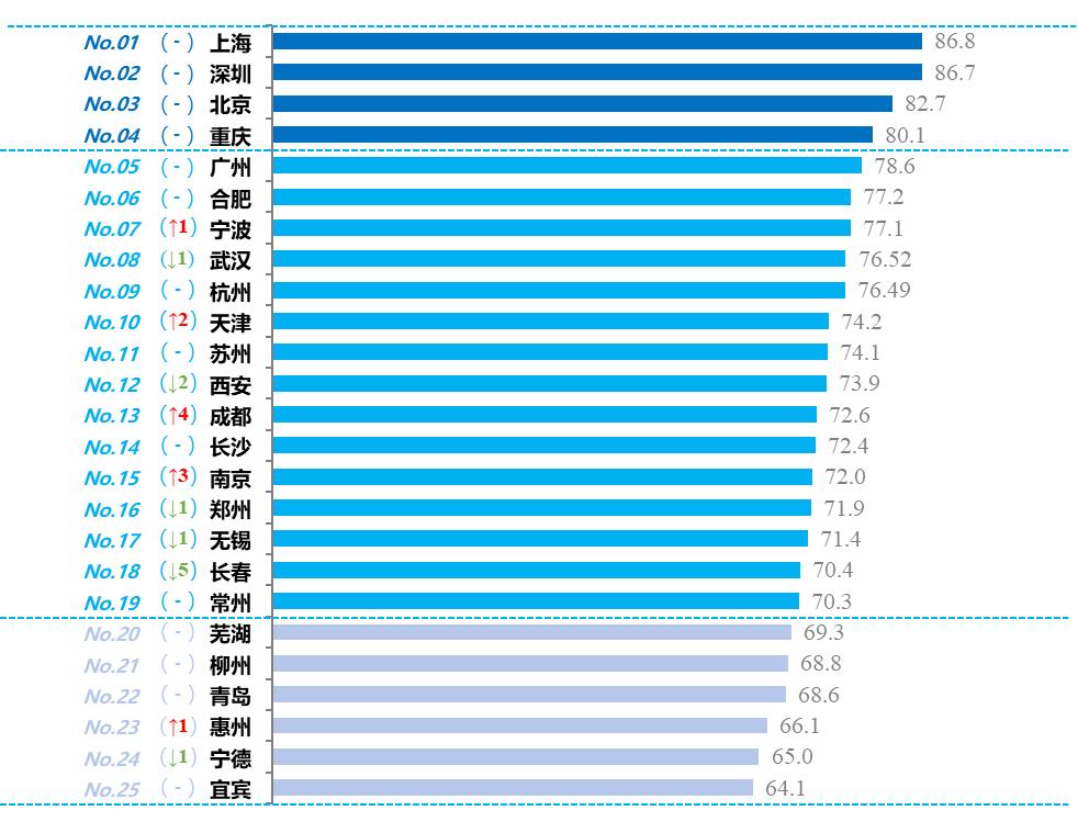 从总指数看,25座城市继续分为三个梯队,但第一、二梯队城市数量扩容。第一梯队城市评估分值大于80分,综合竞争优势明显,由3座城市扩容至4座城市,其中上海、深圳、北京继续保持前三位,重庆分值突破80分,进入领跑方阵。第二梯队城市评估分值在70-80分之间,具有独特比较优势,由13座城市扩容至15座城市,分别是广州、合肥、宁波、武汉、杭州、天津、苏州、西安、成都、长沙、南京、郑州、无锡、长春、常州。第三梯队城市评估分值在60-70分之间,在细分领域各有特色长板或较大发展潜力,主要有6座城市,分别是芜湖、柳州、青岛、惠州、宁德、宜宾。