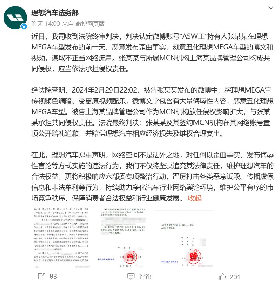 此前9月22日,理想汽车法务部发文表示,近日,我司收到法院终审判决,判决认定微博账号“A5W工”持有人张某某在理想MEGA车型发布的前一天,恶意发布歪曲事实、刻意丑化理想MEGA车型的博文和视频,谋取不正当网络流量。张某某与所属MCN机构上海某品牌管理公司构成共同侵权,应当依法承担侵权责任。