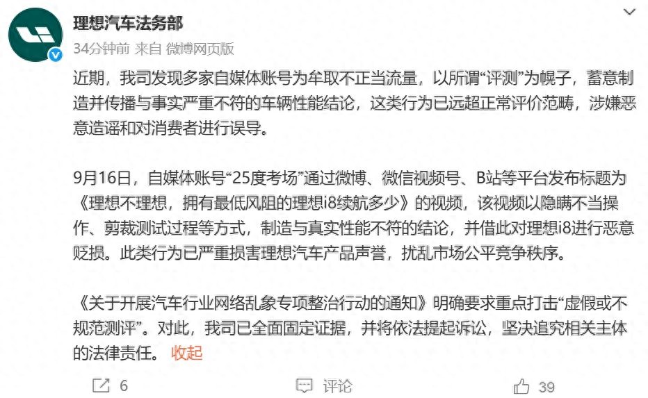 9月16日,自媒体账号“25度考场”通过微博、微信视频号、B站等平台发布标题为《理想不理想,拥有最低风阻的理想i8续航多少》的视频,该视频以隐瞒不当操作、剪裁测试过程等方式,制造与真实性能不符的结论,并借此对理想i8进行恶意贬损。此类行为已严重损害理想汽车产品声誉,扰乱市场公平竞争秩序。