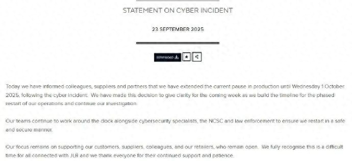 9月23日,捷豹路虎官方发布声明称,已通知员工、供应商及合作伙伴,因网络安全事件影响,将当前停产状态延长至2025年10月1日。公司将在此期间制定分阶段恢复运营的时间表并持续推进调查工作。