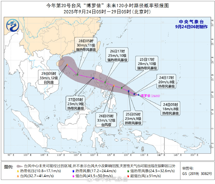 据中央气象台消息,9月24日早晨5点钟,今年第20号台风“博罗依”(热带风暴级;英文名称:Bualoi;名字来源:泰国;名称意义:一种泰式甜品)在菲律宾以东洋面生成。预计27日它将进入南海东部海域,之后向西北方向移动,强度有所增强。