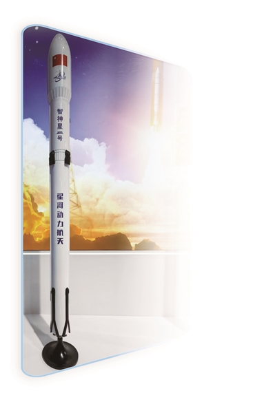 图为北京星河动力航天科技股份有限公司展出的“智神星二号”运载火箭模型。