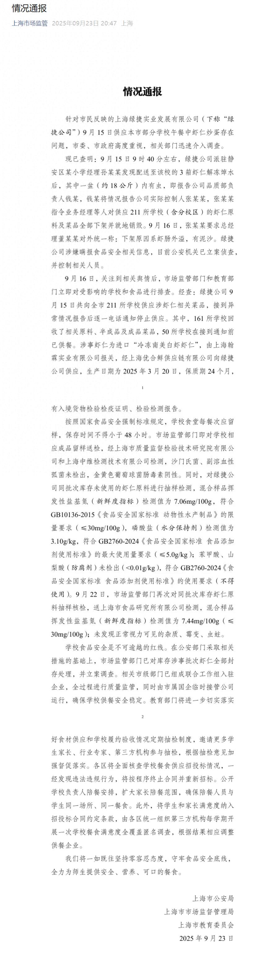 现已查明:9月15日9时40分左右,绿捷公司派驻静安区某小学经理孙某某发现配送至该校的3箱虾仁解冻焯水后,其中一盆(约18公斤)内有虫,即报告公司品质部负责人钱某,钱某将情况报告公司实际控制人张某某,张某某指令业务经理等人对供应 211 所学校(含分校区)的虾仁原料及菜品全部下架并就地销毁。9月16日,张某某要求总经理董某某对外统一称:下架原因系虾肠外溢,有泥沙。绿捷公司涉嫌瞒报食品安全相关信息,目前公安机关已立案侦查并控制相关人员。