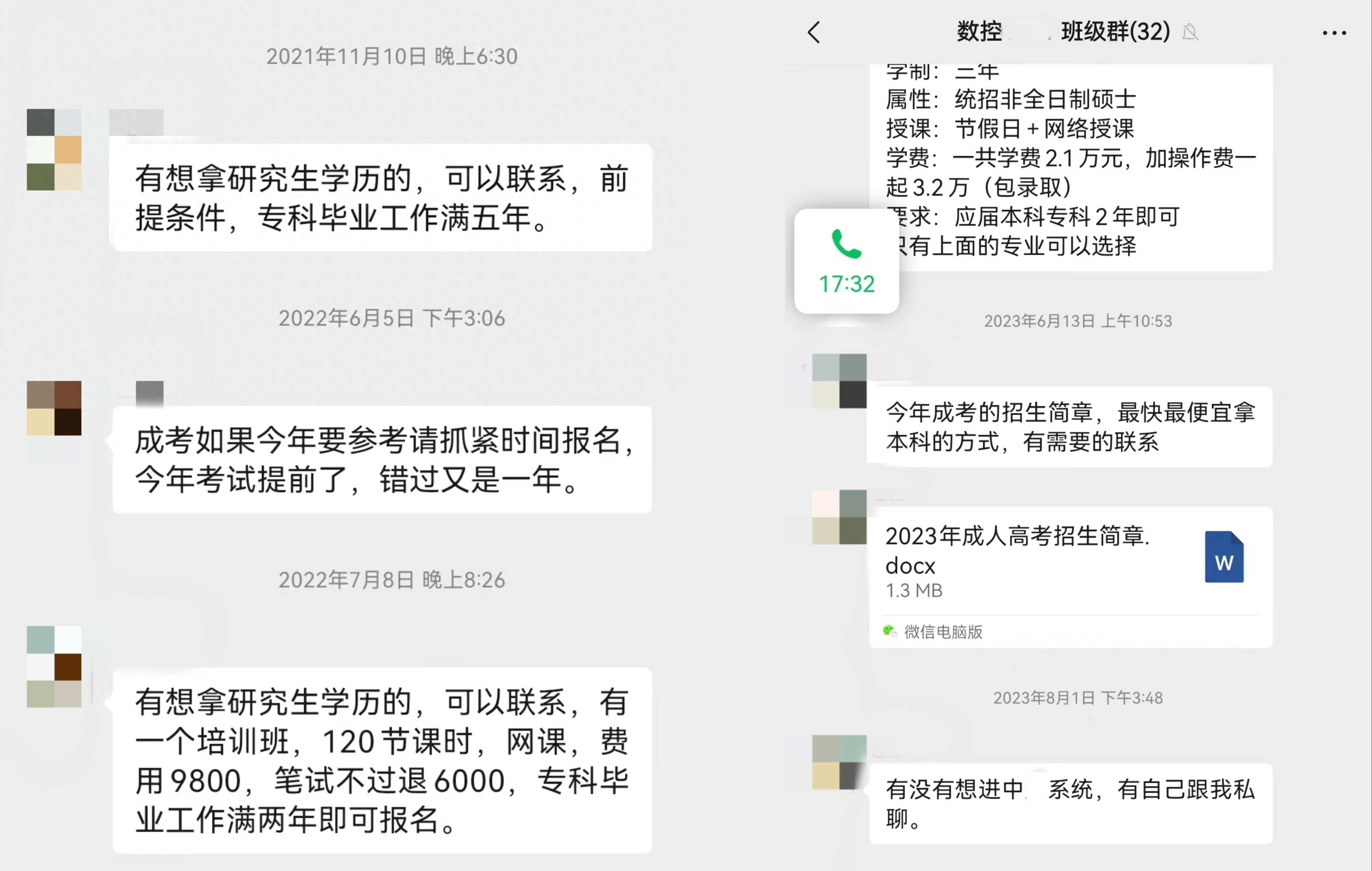 2022年前后,左某某在班级群、朋友圈多次发表提升学历、推荐工作的言论。受访者供图