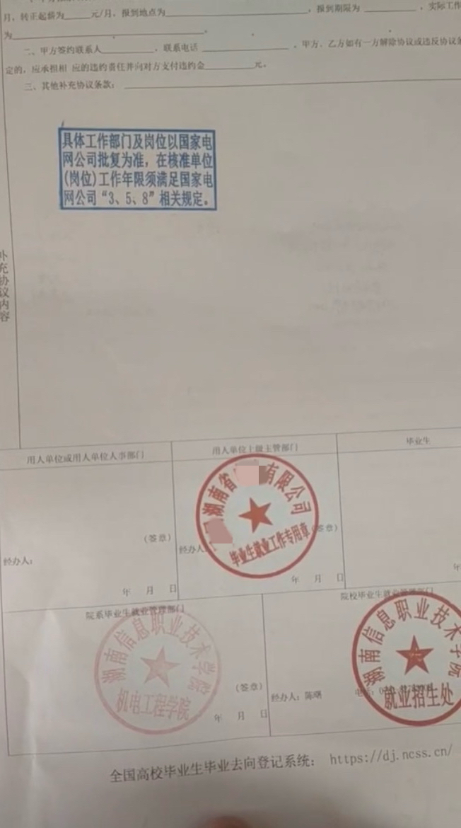 今年4月,左某某曾发出一份加盖“湖南省某国企毕业生就业工作专用章”“湖南信息职业技术学院机电工程学院”“湖南信息职业技术学院就业招生处”三章的毕业生就业协议书视频。