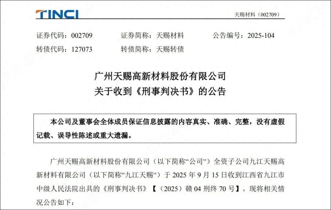 9月15日,广州天赐高新材料股份有限公司(简称“天赐材料”)发布公告,披露其全资子公司九江天赐高新材料有限公司(简称“九江天赐”)诉李某、郑某某侵犯商业秘密罪一案的终审判决结果。江西省九江市中级人民法院作出的二审判决,对一审刑期进行了改判,但高额罚金与追缴等维持原判。