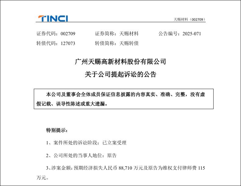 值得关注的是,刑事诉讼仅是这场商业纠纷的开端。今年7月,天赐材料已针对永太科技、永太高新及李某、郑某某等12名相关方,向江西省高级人民法院提起民事诉讼,索赔8.87亿元经济损失与115万元律师费,要求被告立即停止侵害行为,永太科技销毁侵权产线设备与工艺资料。