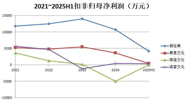 综合来看,新经典毛利率相对最高最为稳定;荣信文化稳中有升;果麦文化之前毛利率与新经典相当,2025年上半年有所下滑;读客文化在毛利率方面相对表现最差。