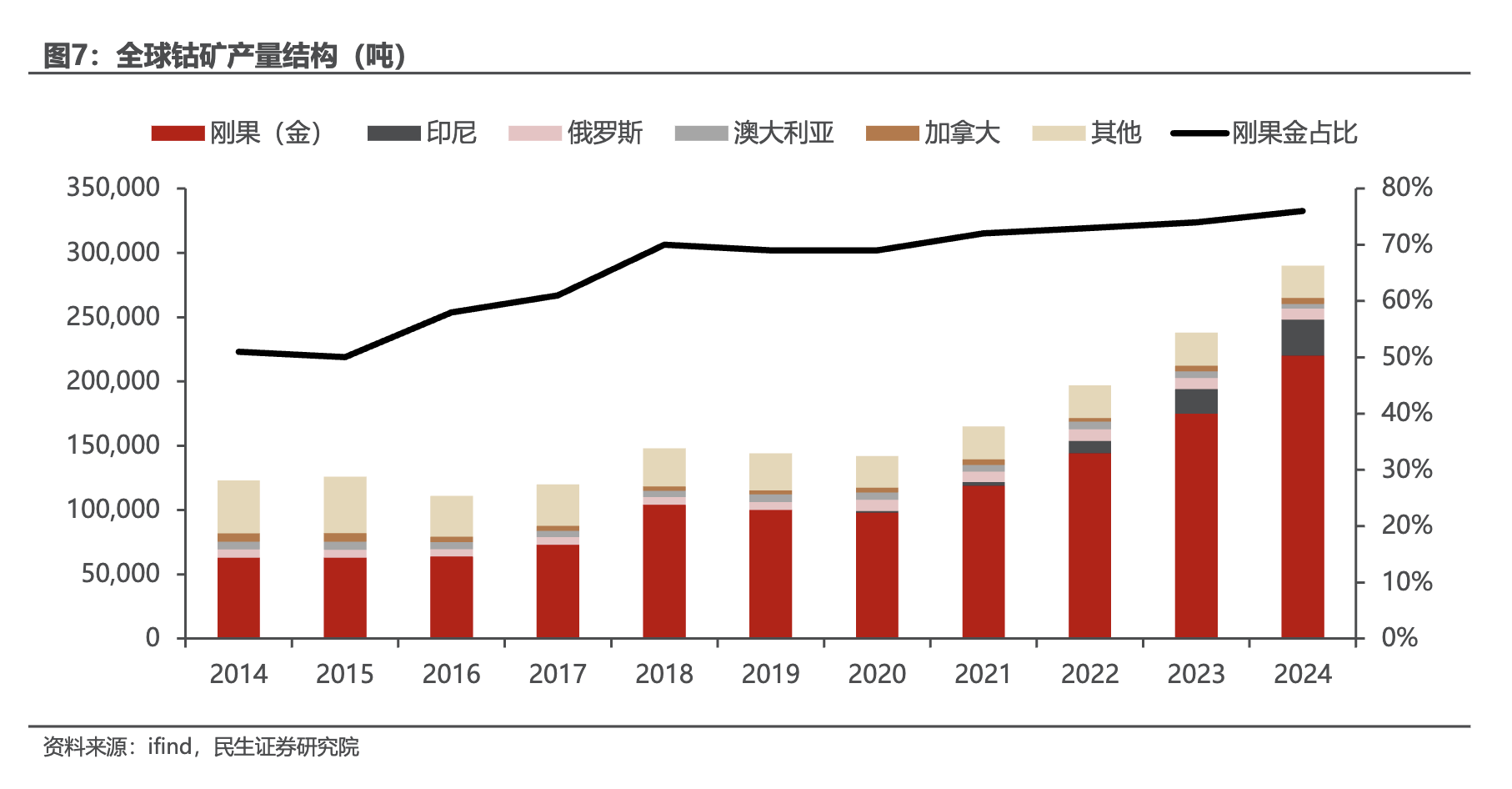 全球钴矿供应高度集中,根据美国地质调查局(USGS)数据,2024年全球钴矿产量29万吨,同比增加21.8%,其中刚果(金)产量22万吨,同比增长25.7%,全球占比76%。同时印尼由于湿法镍项目逐步投产,钴原料供应快速增长,但整体规模较小。