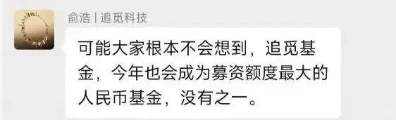 其配图为微信备注为“俞浩|追觅科技”的发言:“可能大家根本不会想到,追觅基金,今年也会成为募资额度最大的人民币基金,没有之一。”