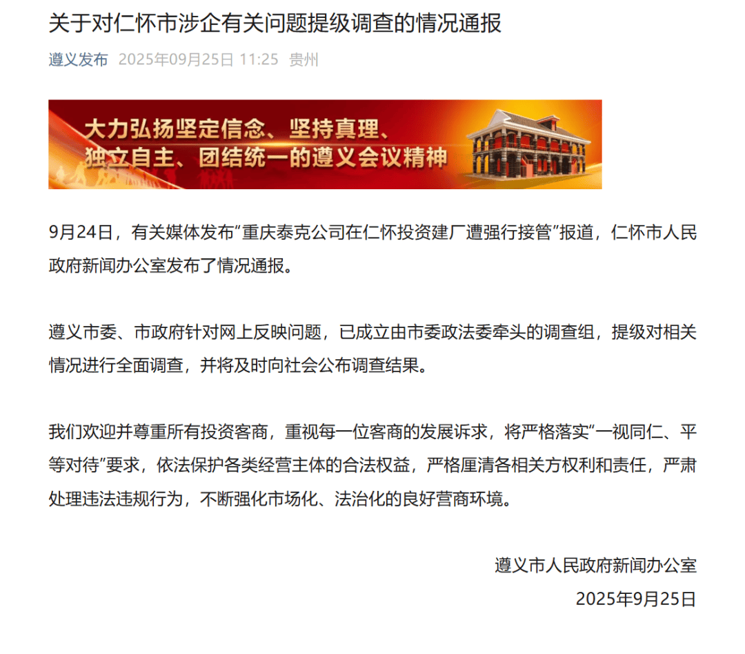 9月24日,有关媒体发布“重庆泰克公司在仁怀投资建厂遭强行接管”报道,仁怀市人民政府新闻办公室发布了情况通报。