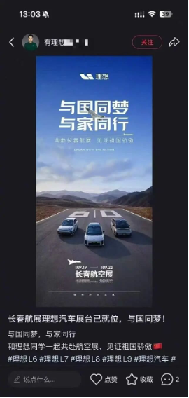 理想汽车在2025年长春航空展期间,发布含有“歼-20”“歼-10”“空警-500”等多种飞机形象与理想汽车车型同框的海报,引发热议。
