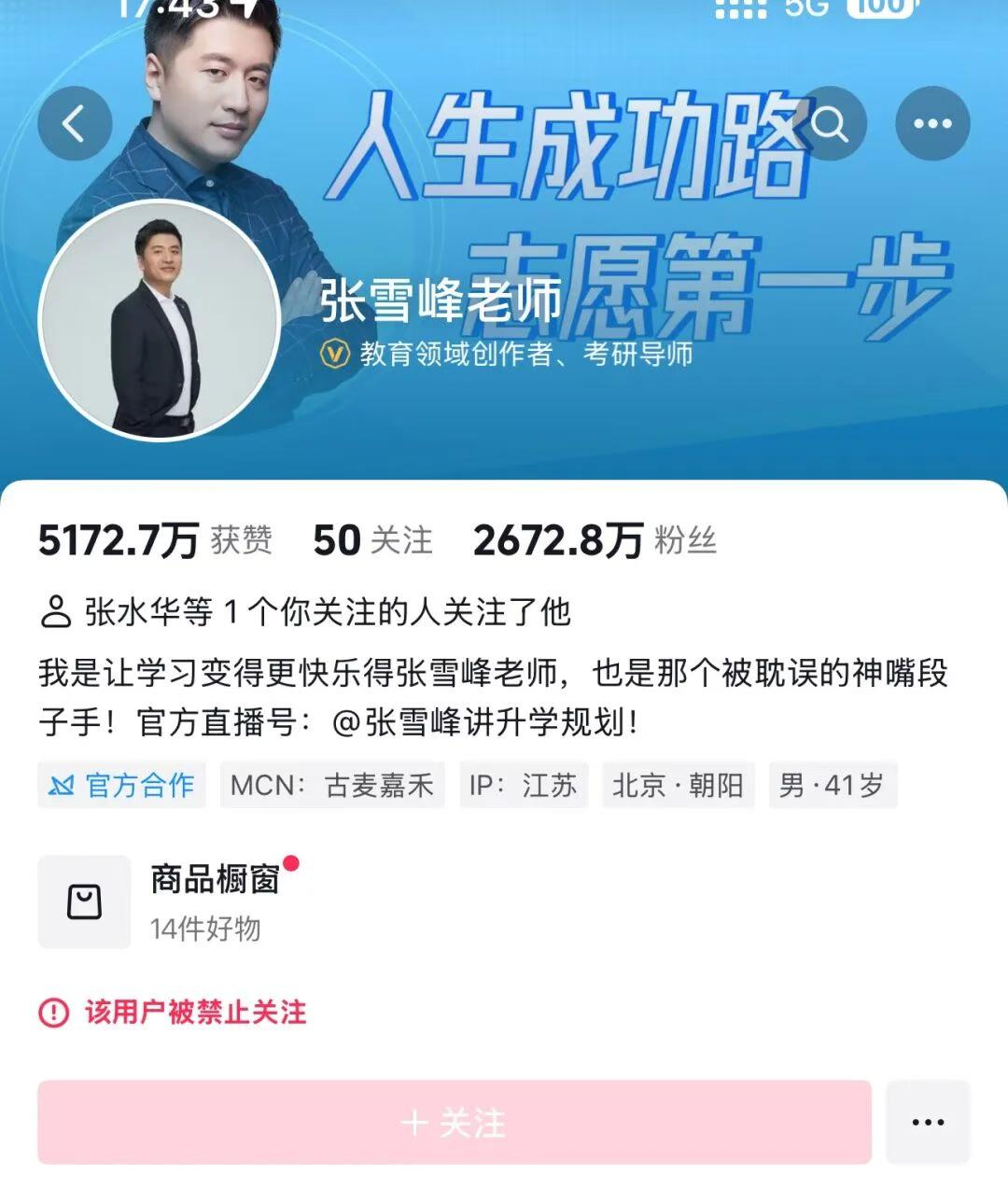 9月24日,知名高考志愿导师张雪峰的微博、抖音、快手、B站及小红书平台的社交账号出现异常,被禁止关注。这五个平台账号的粉丝合计超过6500万,近年来张雪峰的言论多次引发讨论。