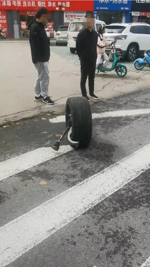 附近一商户告诉记者,事发于9月24日上午9时35分左右,疑似是车辆撞到道沿,导致右前轮掉落。