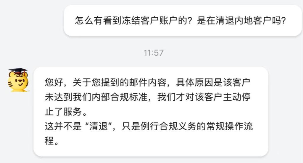 近日,有关老虎证券冻结客户账户、限制买入及入金(可平仓提款)的邮件截图在业界流传。9月24日,澎湃新闻记者以投资者的身份咨询老虎证券客服,老虎证券客服回应称:“具体原因是该客户未达到我们内部合规标准,我们才对该客户主动停止了服务。这并不是‘清退’,只是例行合规义务的常规操作流程。”
