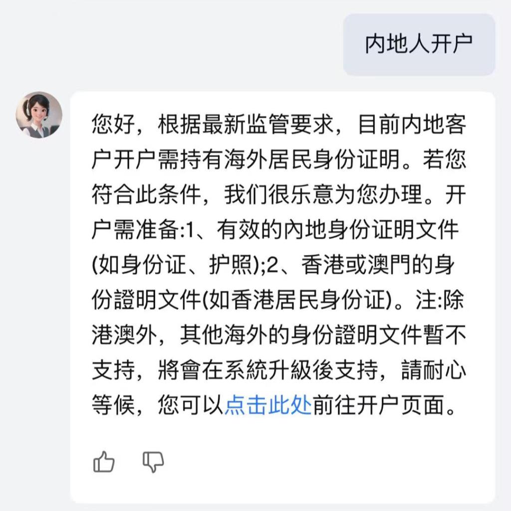 该客服进一步明确,中国内地居民如需开户,需要提供境外的有效身份文件以及境外的工作生活相关地址证明文件。