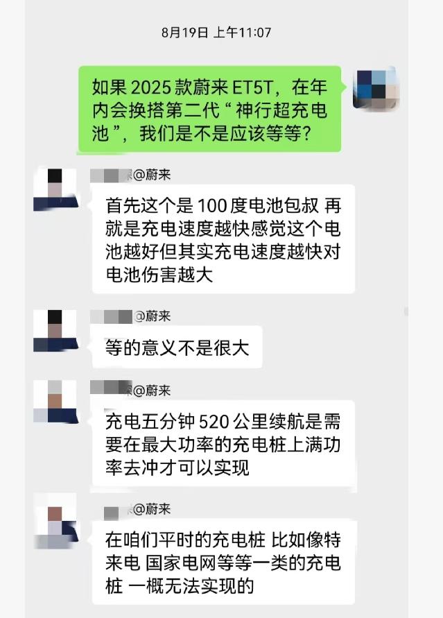 “今年8月中旬,在蔚来汽车金狮广场店看中一款续航里程550公里的纯电动轿车(ET5T),其搭载的75度电池包是当时的标准配置。我在提车前询问了两次电池包升级的事,因为知道电动汽车配置更新很快。”陈先生出示的聊天记录显示,他在8月19日和22日两次向销售顾问询问有关该款车型近期电池包升级情况。对方明确表示,厂家暂无任何升级通知,“等的意义不是很大”。“8月19日试驾过程中,销售人员不仅否认公司近期有电池包升级计划,还强调ET5T不在电池包升级之列,不会有大变动。试驾车辆有全程录音,其中包含关键证据。”陈先生说。