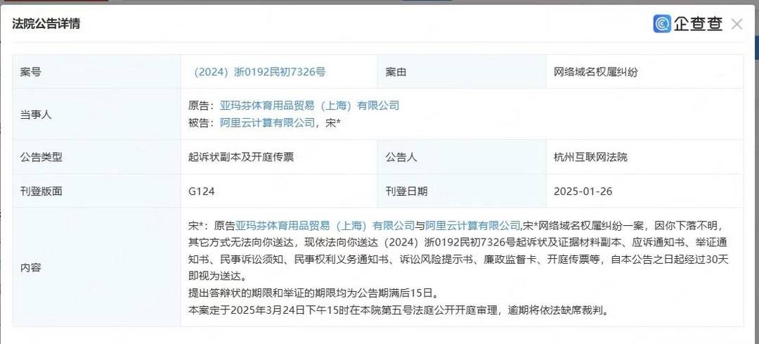不过,记者进一步查询企查查发现,始祖鸟背后公司亚玛芬体育用品贸易(上海)有限公司的法院公告一栏中,有一则亚玛芬体育用品贸易(上海)有限公司与宋某相关的网络域名权属纠纷,公告为2025年1月26日杭州互联网法院发布的起诉状副本及开庭传票,其中阿里云计算有限公司、宋某作为被告,该宋某或为此位博主。
