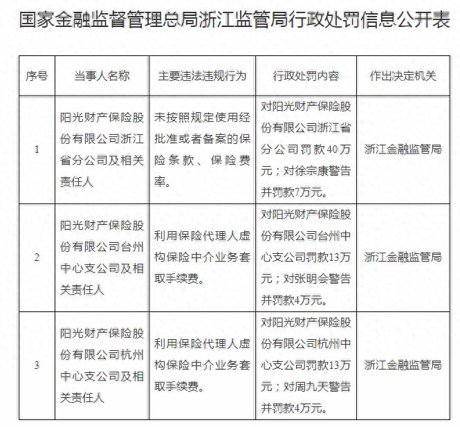 因利用保险代理人虚构保险中介业务套取手续费,浙江金融监管局对阳光财产保险股份有限公司台州中心支公司罚款13万元,对相关责任人张明会警告并罚款4万元;对阳光财产保险股份有限公司杭州中心支公司罚款13万元,对相关责任人周九天警告并罚款4万元。