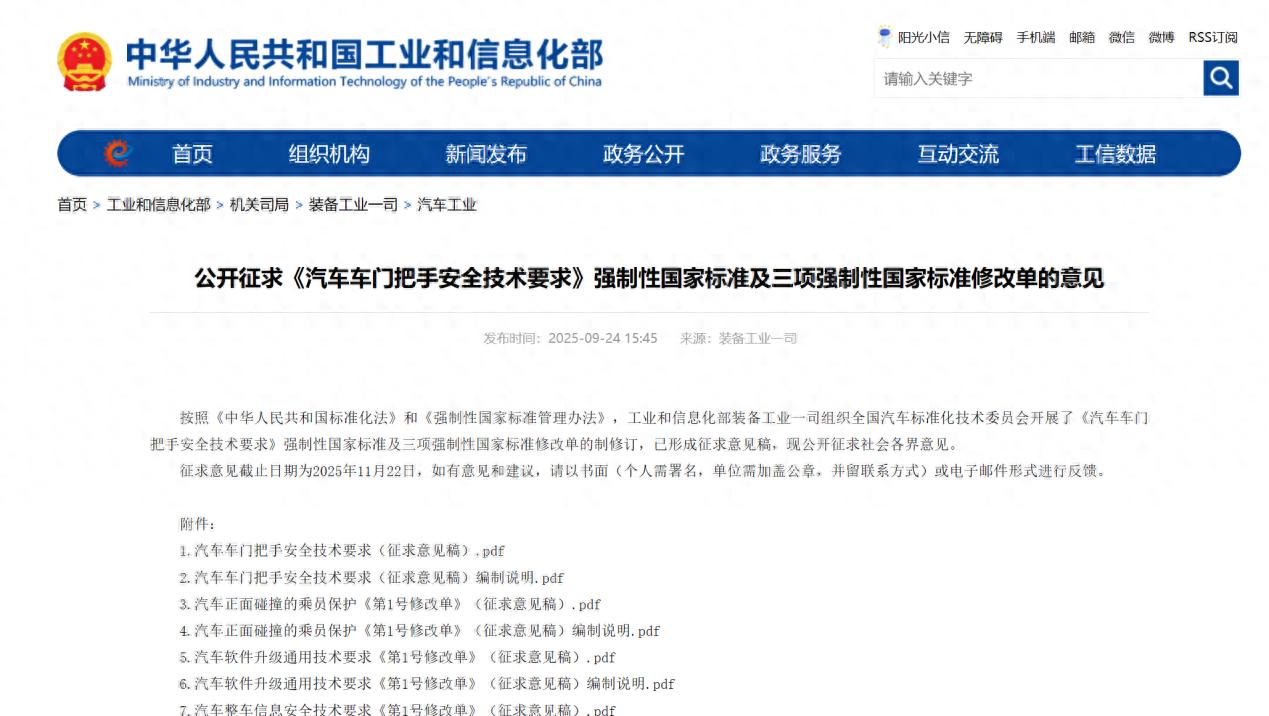 (9月24日,工信部发布《汽车车门把手安全技术要求》征求意见稿。工信部官网/图)