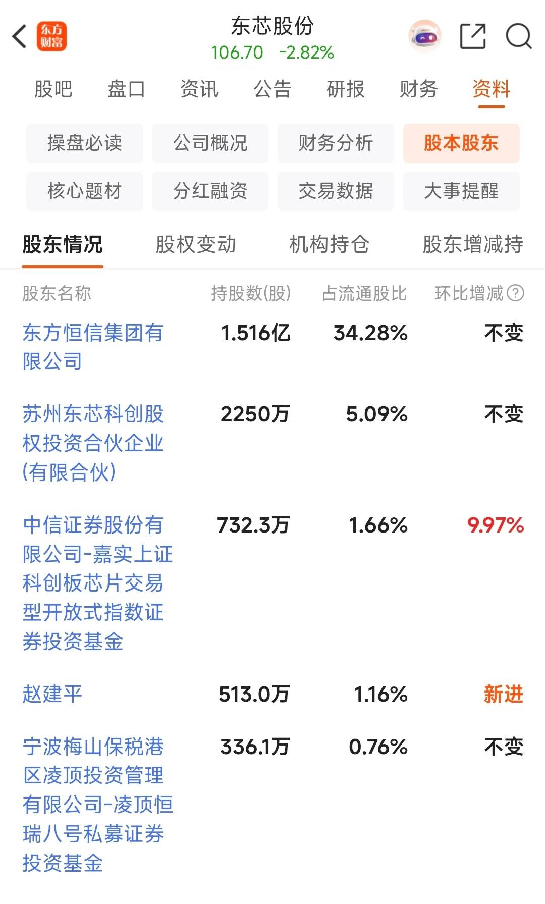 东芯股份的大涨,也让“牛散”赵建平再度活跃在公众视野之中。今年二季度,赵建平大举建仓东芯股份,买入513万股,以1.16%的持股比例位列公司第四大流通股东,买入成本区间集中在23.4元至36.97元/股之间。截至记者发稿,以东芯股份的最新股价计算,赵建平的持仓市值仍然高达5.4亿元,若持股至今,浮盈约3.5亿元。