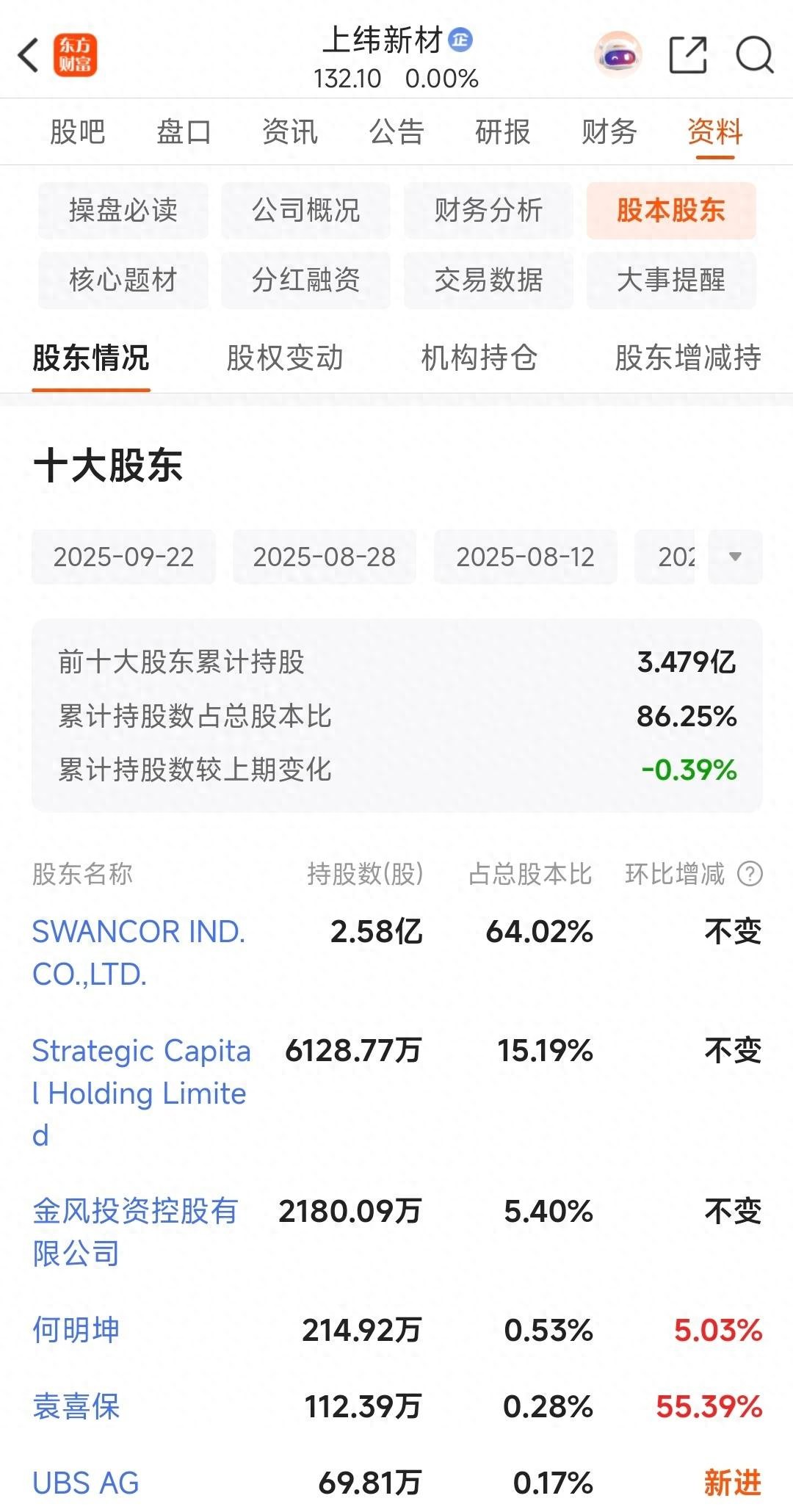 翻阅上纬新材的股东名单,牛散何明坤赫然在列。记者查阅公开资料发现,何明坤最早买入上纬新材是在2022年四季度,彼时何明坤作为新进股东,持有上纬新材93.21万股。2024年一季度和四季度,何明坤又分别加仓1.94万股和101.42万股。截至今年6月30日,何明坤共持有上纬新材214.9万股,占公司总股本的0.53%。2024年四季度,上纬新材的股价还在6.08元/股至7.99元/股的低位,如果何明坤一直持有上纬新材未出售,按照9月25日上纬新材的股价计算,其持股市值目前已经达到2.84亿元,浮盈超15倍。