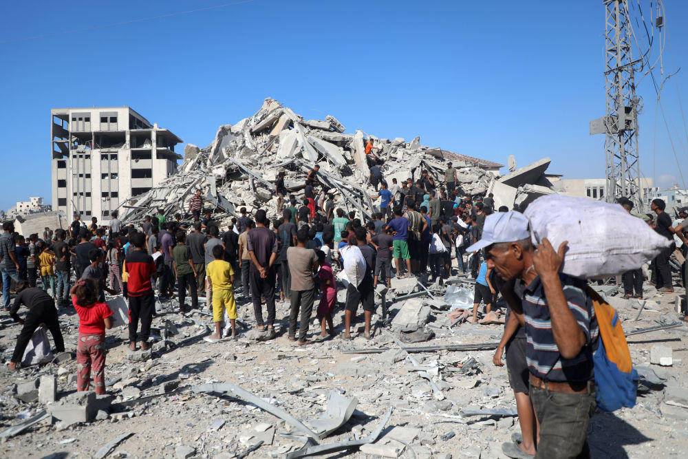 2025年9月8日,人们在加沙城查看一座高层建筑遭以色列军队空袭后的废墟。新华社发(里泽克·阿卜杜勒贾瓦德摄)
