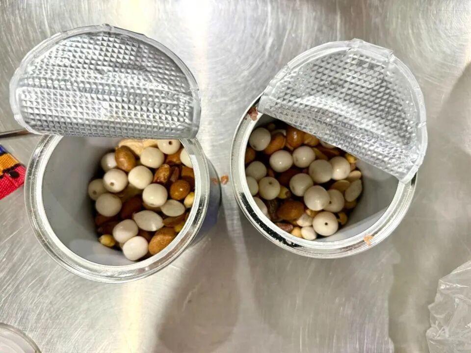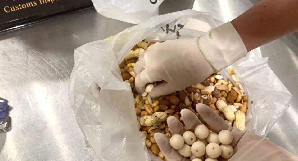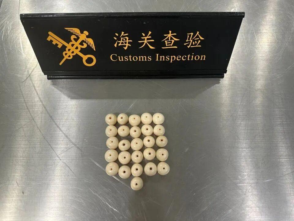 近日,杭州海关所属杭州萧山机场海关关员在对进境航班进行监管时,发现一名旅客的行李机检图像显示异常,现场关员随即对其进行拦截并作进一步查验。经开箱检查,关员在其行李箱内的罐头中发现与坚果混装在一起的疑似象牙珠子26件。