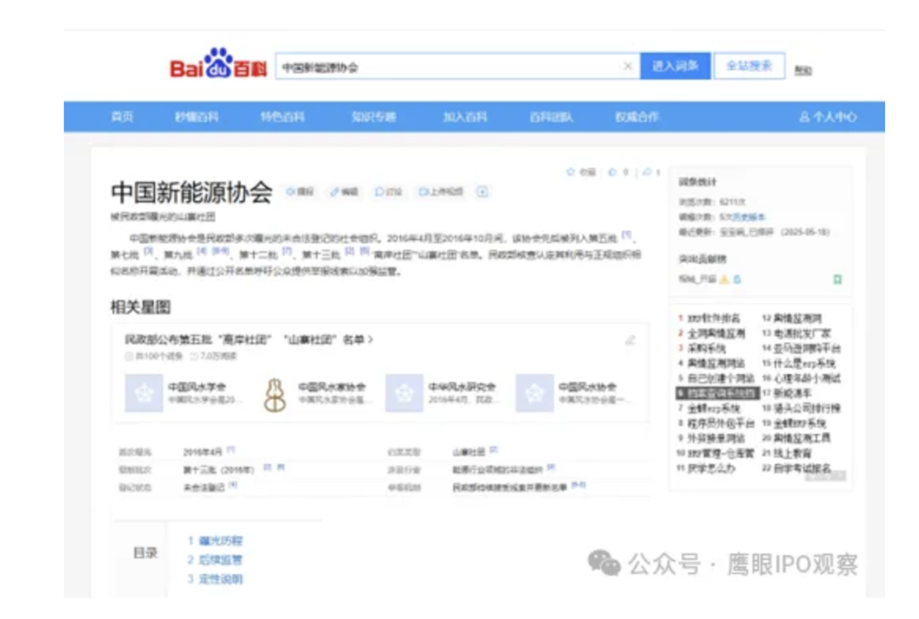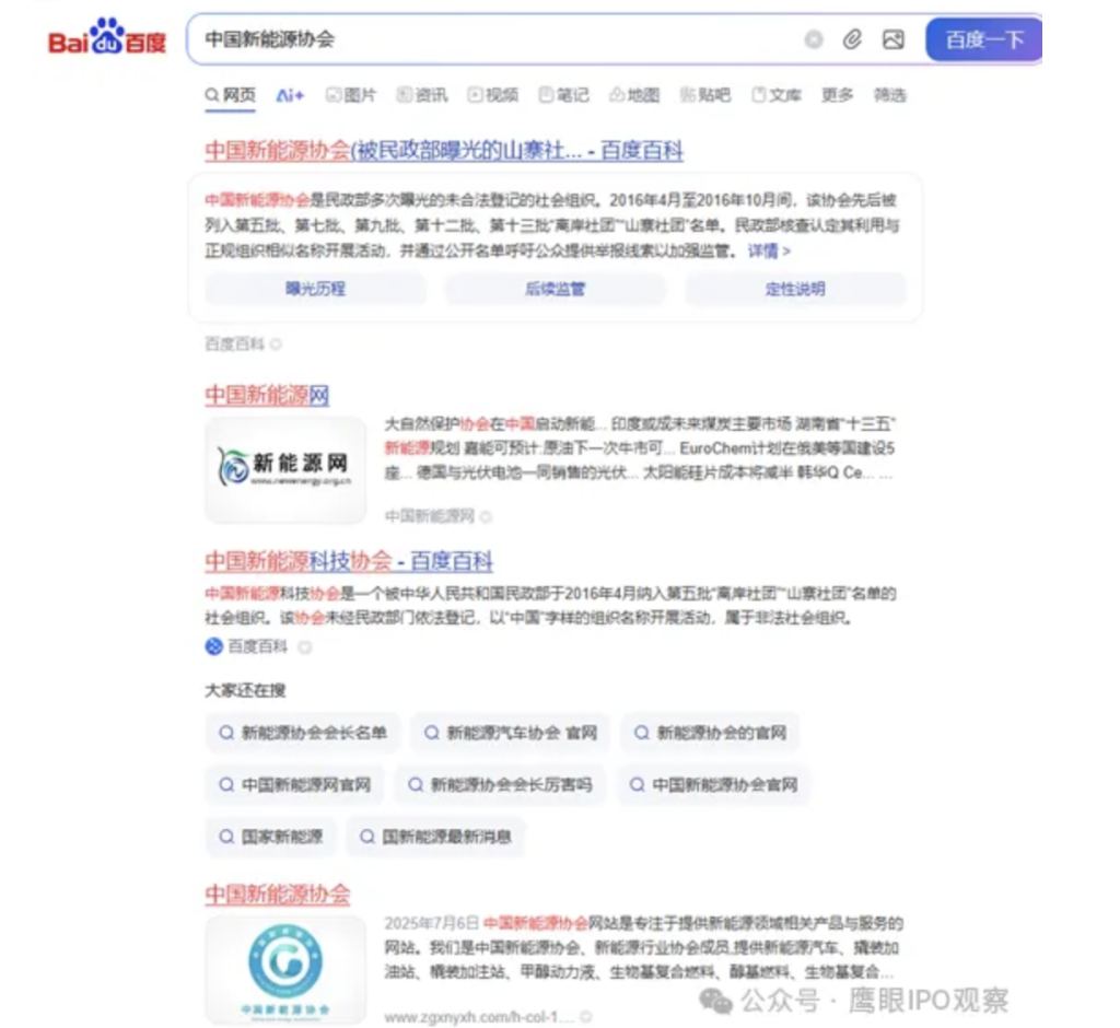 百度百科还补充了对其的“定性说明”——民政部指出,此类社团通常通过注册境外机构在境内活动,利用名称混淆性获取不当利益。2016年4月至2021年8月期间,中国新能源协会多次被民政部列为“离岸社团”“山寨社团” 。