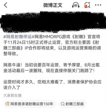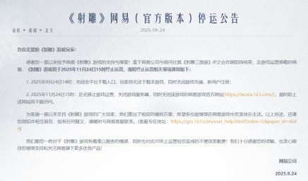 泰山财经记者获悉,9月24日,网易旗下武侠游戏《射雕》发布停运公告,宣布将于11月24日终止运营,引发广泛关注。记者注意到,不少用户在社交平台吐槽质疑网易“割韭菜”,在停运前两个月内推出氪金活动。此外,游戏中未消耗的“直充金锭”,网易也未提供现金退款。