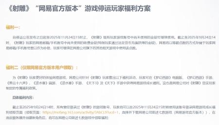 同时公布的补偿方案显示,用户账户中未使用的收费金锭将按等值点数返还至绑定账号,可用于网易旗下其他游戏;曾登录《射雕》的账号还可在《梦幻西游》《逆水寒》等七款游戏中领取专属福利。