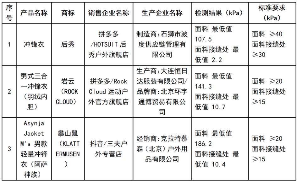 在标称执行新国标的19批次样品里,3批次未明示级别,按Ⅰ级指标考核后,标称品牌为“后秀”的冲锋衣面料接缝处洗后静水压值未达到标准要求,检测结果仅2.2kPa。15批次标称执行Ⅱ级指标的产品中,标称品牌为“岩云(ROCK CLOUD)”和标称品牌为“攀山鼠(KLATTERMUSEN)”的冲锋衣面料接缝处洗后静水压值未达到标准要求。