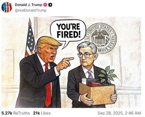 在这张发布在特朗普旗下社交媒体平台Truth Social的漫画里,特朗普指着鲍威尔高喊“你被解雇了!”,而鲍威尔则闷闷不乐地抱着装有个人物品的箱子,似乎即将离开美联储——背景中呈现着美联储标志性的徽章图案。