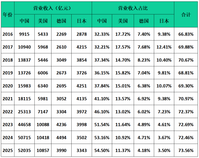 表2 2016-2025年“500强”企业中中美德日企业营收占比情况