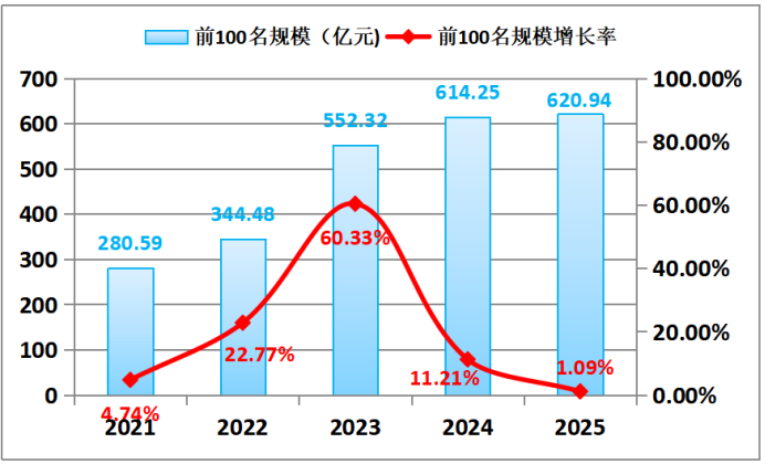 前100企业平均规模为620.94亿元,比上年的614.25亿元增加6.69亿元,增长1.09%,增幅比上年的11.21%减少10.12个百分点(见图15)。