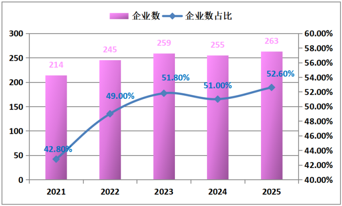 一是企业数上,2025年500强企业中,中国企业数为263家,比上年的255家增加8家,占比52.60%(见图9)。