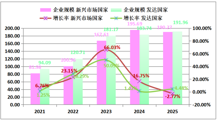 ▲图6 2021-2025年“500强”企业中新兴市场国家与发达国家企业规模(亿元)及增长率